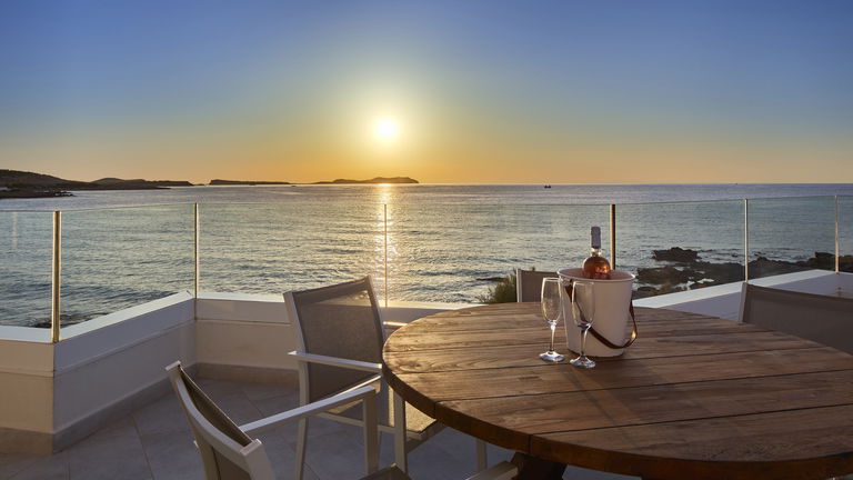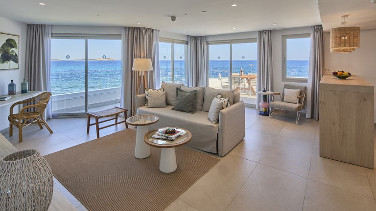 This apartment is the ultimate showstopper for guests who want to treat themselves to their dream Ibiza holiday. Wowing with the most expansive views on the deep blue sea and a huge private terrace, from this incredible vantage point you will feel like you can almost touch the waves. The presidential two-bedroom suite with panoramic sea views houses two large double bedrooms, both with spectacular sea views. One has two single beds and the other a King Size bed plus ensuite bathroom. There is also a second, fully equipped bathroom. Guests will enjoy cooking and socialising in the American-style kitchen that opens out into the living room, creating memories together in the stylish and comfortable surroundings. These luxurious apartments have the most spacious terraces in the entire resort, making them perfect for quality time with the family or a romantic evening with your partner. Located at the front of the building, you will experience jaw-dropping sea and sunset views. A must for sunset lovers!